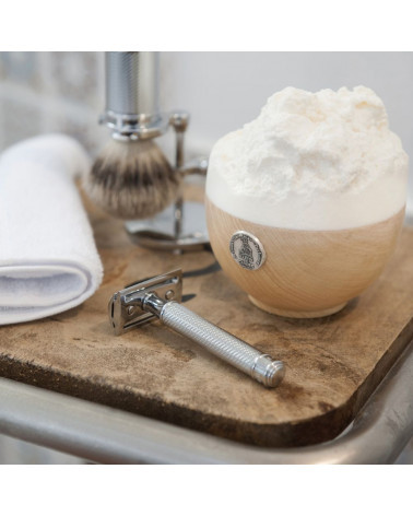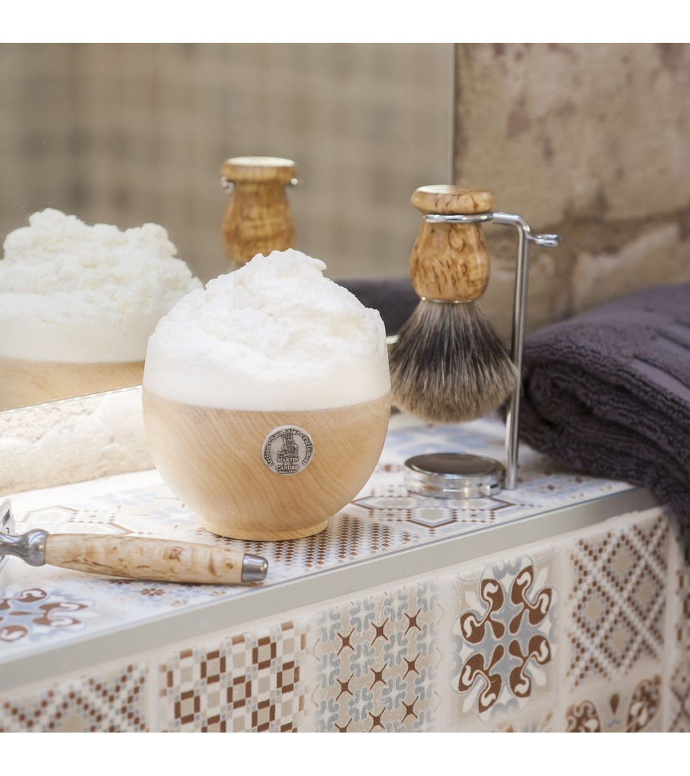 200 grammes de pâte de savon à raser dans un bol en bois tourné par un artisan local.