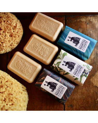 Chaque savon 250g est coupé au fil puis pressé de la fleur "Martin de Candre". Tous les savons sèchent ensuite de six à huit mois dans des caisses en bois de hêtre. Les emballages sont effectués soigneusement à la main dans du papier à la cuve traditionnel ou des papiers imprimés italiens (encres écologiques).